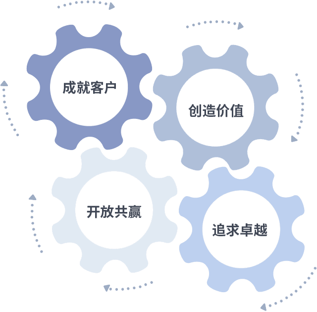 成就客户是一切决策的出发点,,,创造价值是衡量所有工作的标准,,追求卓越是我们做事做人的态度,,开放共赢是我们的格局也是最终的结果。。价值观的齿轮环环相扣,,,推动着组织里的每个人不断向前。。。